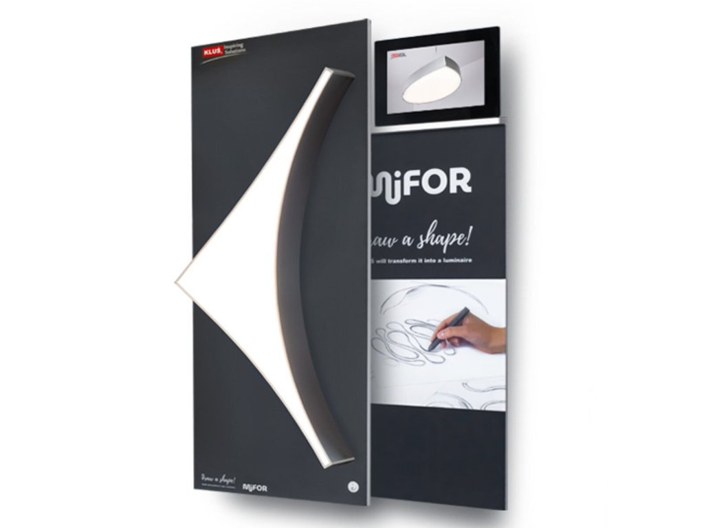 Tabule prezentující systém MIFOR na příkladu svítidla MIFOR "MI-SAIL v2". Jedná se o sadu sestávající ze dvou prvků namontovaných na 230° displeji nebo na zdi, jeden nad druhým. Horní prvek má světelný rámeček, spodní prvek má grafiku a monitor displeje.Doplňkové parametry
