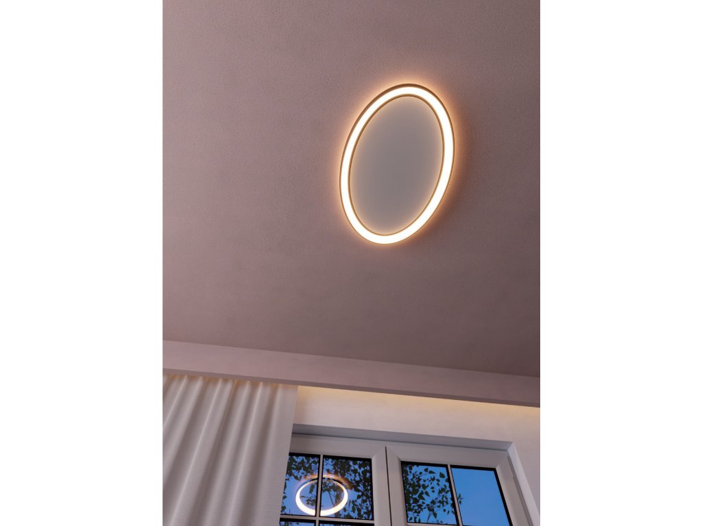 Stropní svítidlo pro interiéry vybavené SMD LED diodami s přímým/nepřímým světlem, možností stmívání a regulace teploty barevného světla od teplé bílé po neutrální bílou. Konstrukce z hliníku a kovu lakovaná do broušené bílé barvy, difuzor pro přímé světlo z bílého opálového akrylátu a pro nepřímé světlo z polystyrenu. Fotografie může být ilustrační.
