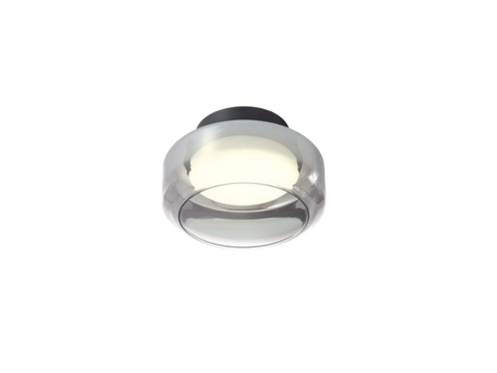 Vnitřní svítidla vybavená SMD LED diodami s možností volby barevné teploty světla, kovová a hliníková konstrukce elektrostaticky lakovaná v pískově černé barvě, dvě foukané skleněné stínidla – vnější s kouřovým přechodovým efektem a vnitřní v opálově bílé barvě. Fotografie může být ilustrační.